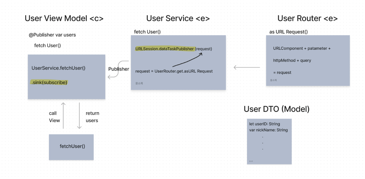 - fetchUsersSuccess ๋ผ๋ PassthroughSubject ๋ฅผ ์ ์ธํด์ค๋๋ค.
