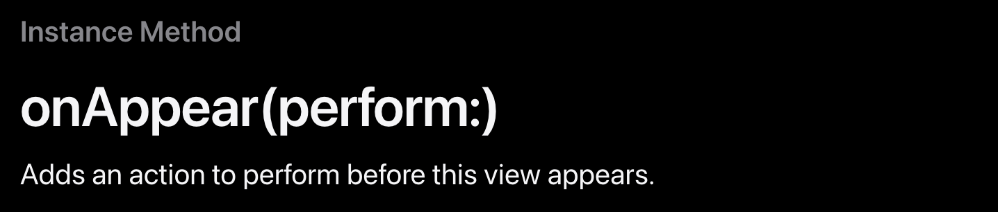 ๊ณต์๋ฌธ์๋ฅผ ์ฐพ์๋ณด๋ฉด onAppear๋ “before this view appears” ๋ทฐ๊ฐ ๋ํ๋๊ธฐ ์ ์ ์คํ๋๋ ๋ฉ์๋์ด๊ณ