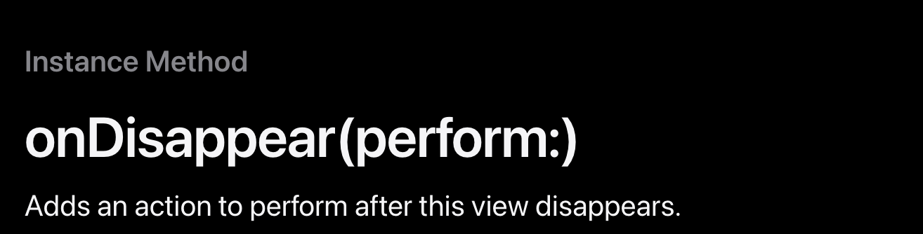 onDisappear ๋ฉ์๋๋ “after this view disappears” ๋ทฐ๊ฐ ์ฌ๋ผ์ง๊ธฐ ์ ์ ์คํ๋๋ ๋ฉ์๋์ด๋ค.