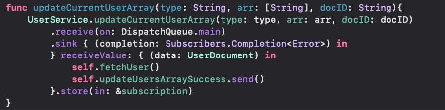 receiveValue ๋ธ๋ก์์ fetchUser ๋ฉ์๋๋ฅผ ๋ถ๋ฌ์ฃผ๋ ๋ก์ง์ผ๋ก ์์ ํ์ฌ ๋ฌธ์ ๋ฅผ ํด๊ฒฐํ๋ค.