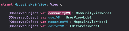 3. ์ ๋ฌ๋ ์ธ์คํด์ค๋ฅผ MagazineMainView(ํ์๋ทฐ) ์์๋ ObservedObject๋ก ๋ฐ์์ค๋ค.