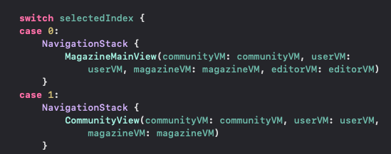 2. MagazineMainView(ํ์๋ทฐ) ์ ๋ค์๊ณผ ๊ฐ์ด ์ธ์คํด์ค๋ฅผ ์ ๋ฌํ๋ค.